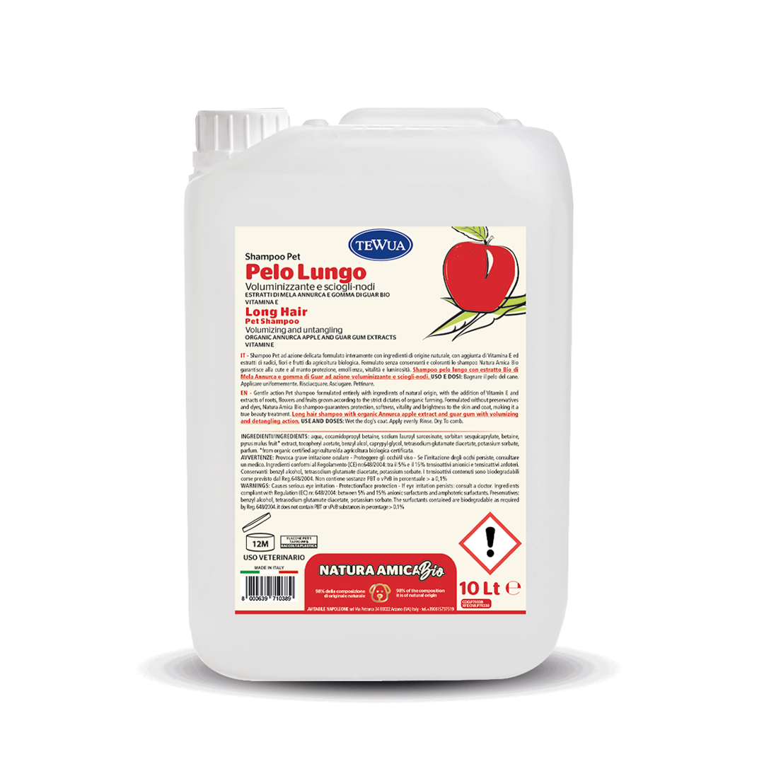 Long hair shampoo with organic Annurca apple extract and guar gum with volumizing and detangling action.